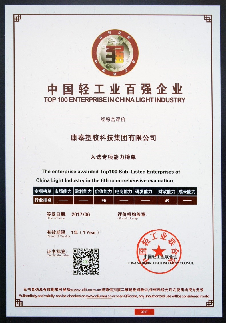 6月20日上午,由中國(guó)輕工業(yè)聯(lián)合會(huì)主辦、中國(guó)輕工業(yè)信息中心承辦的第六屆中國(guó)輕工業(yè)百?gòu)?qiáng)企業(yè)頒獎(jiǎng)盛典暨“智慧輕工”高峰論壇在中國(guó)職工之家隆重召開(kāi)。大會(huì)向社會(huì)各界隆重發(fā)布了“2016年度中國(guó)輕工業(yè)百?gòu)?qiáng)企業(yè)”榮譽(yù)榜單。康泰集團(tuán)有限公司憑借良好的價(jià)值能力和財(cái)政能力再度入圍 “2016年度中國(guó)輕工業(yè)百?gòu)?qiáng)企業(yè)”及“中國(guó)塑料管材行業(yè)十強(qiáng)企業(yè)”榜單。康泰集團(tuán)北京分公司經(jīng)理蔣華成代表公司參加會(huì)議并接牌。