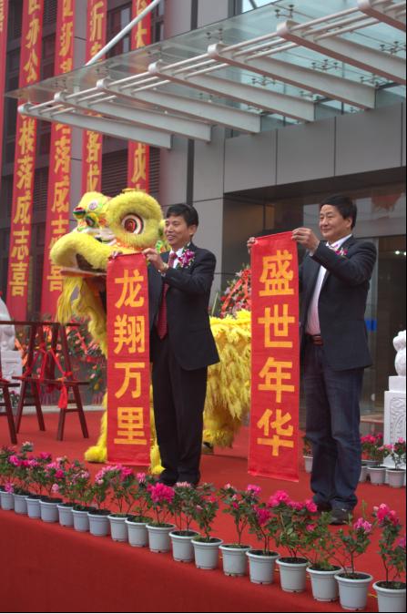 (康泰塑膠科技集團(tuán)董事長(zhǎng)林云青先生、副董事長(zhǎng)葉日才先生接雄獅恭賀對(duì)聯(lián))
