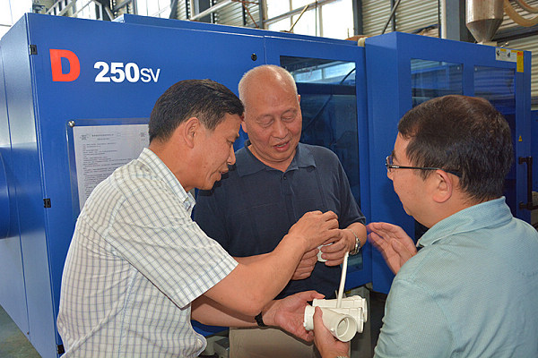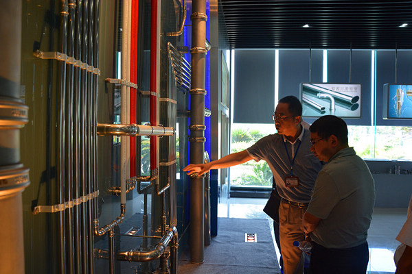 ??? 6日下午2點(diǎn),考察團(tuán)一行抵達(dá)集團(tuán)公司,在林總裁的帶領(lǐng)下,考察團(tuán)首先參觀了公司生產(chǎn)車(chē)間,其中重點(diǎn)參觀考察 了成品庫(kù)房、管件車(chē)間、自動(dòng)卸料系統(tǒng)、模具事業(yè)部、燃?xì)馍a(chǎn)線(xiàn)、技術(shù)研發(fā)中心、不銹鋼公司給水部及展廳、集團(tuán)公司展廳。