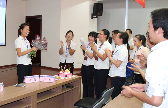 演講比賽結(jié)束后,9月員工生日會隆重舉行。很多9月生日的員工因?yàn)楣ぷ髟蛭茨苓_(dá)到現(xiàn)場,隨著“祝你生日快樂”熟悉的旋律響起,一段9月生日員工的PPT向大家展示了9月壽星們在工作崗位上的精神風(fēng)貌,而來自采供中心的何瑤代表他們接受了大家的鮮花與祝福。