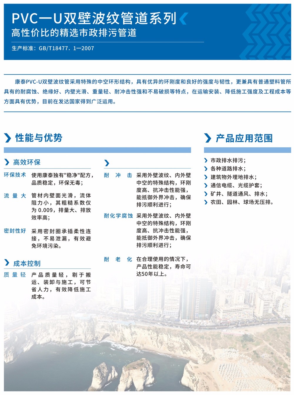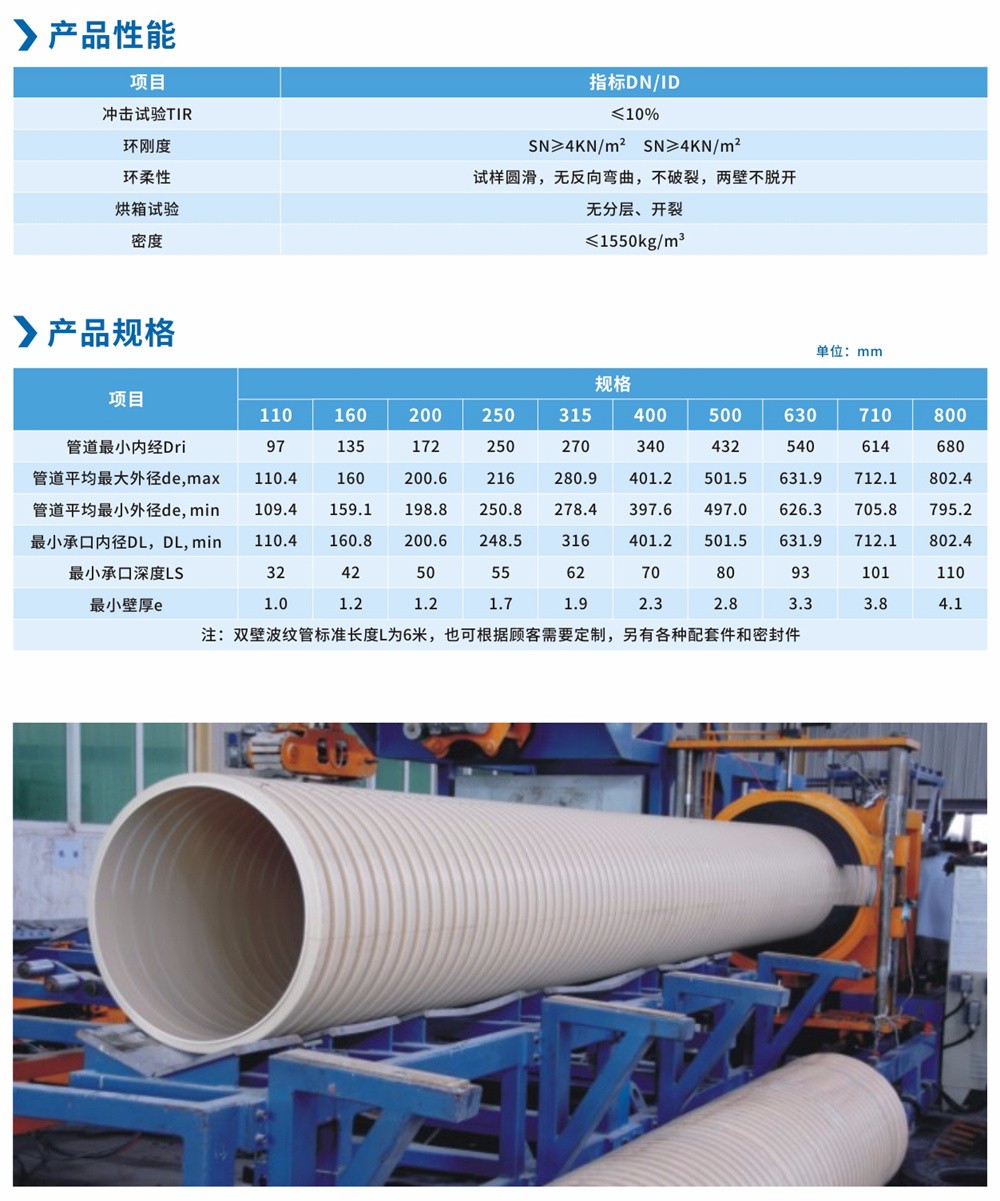 雙壁波紋管有普通塑料管所具有的耐腐蝕性好、絕緣性好、內(nèi)壁光滑、流動(dòng)阻力小等特點(diǎn)以外,還因采用了特殊的中空環(huán)形結(jié)構(gòu),具有優(yōu)異的環(huán)剛度和良好的強(qiáng)度與韌性,及重量輕、耐沖擊性強(qiáng)、不易破損等特點(diǎn),目前在發(fā)達(dá)國家的諸多領(lǐng)域已經(jīng)廣泛應(yīng)用,尤其是在美國、加拿大、日本以及歐洲許多國家,雙壁波紋管廣泛應(yīng)用于市政排水排污、農(nóng)業(yè)灌溉、煤礦通風(fēng)、化工,此外,對(duì)比混凝土、鑄鐵管,有運(yùn)輸安裝方便,降低施工人員勞動(dòng)強(qiáng)度及降低工程的總投資等優(yōu)勢(shì),是混凝土、鑄鐵管的理想換代產(chǎn)品。