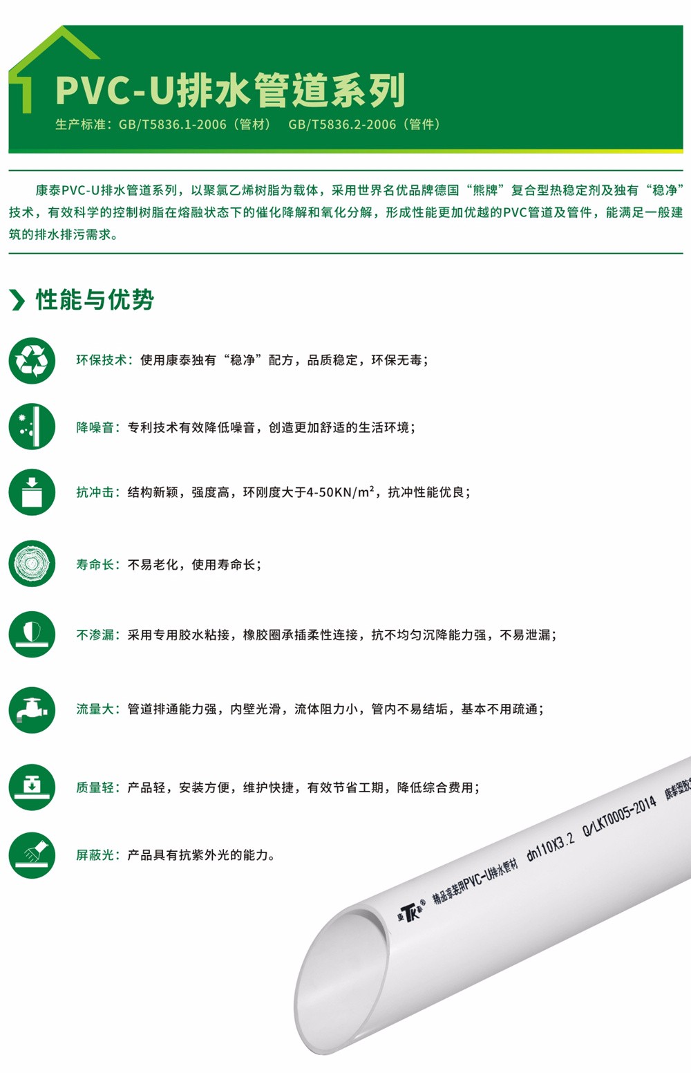 康泰PVC-U排水管道系列,以聚氯乙烯樹脂為載體,采用世界名優(yōu)品牌德國“熊牌”復合型熱穩(wěn)定劑及獨有“穩(wěn)凈”技術(shù),有效科學的控制樹脂在熔融狀態(tài)下的催化降解和氧化分解,形成性能更加優(yōu)越的PVC管道及管件,能滿足一般建筑的排水排污需求。