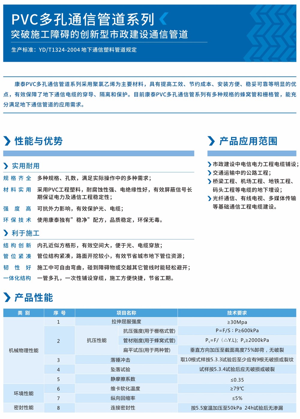 PVC多孔通信管道用PVC多孔管制作材料采用聚氯乙烯為主,代替?zhèn)鹘y(tǒng)的水泥管塊,鋼管套管等保護(hù)套,用于對地下通信電纜的穿導(dǎo)、隔離和保護(hù),具有提高工效、節(jié)約成本、安裝方便、穩(wěn)妥可靠等明顯的優(yōu)點(diǎn),逐步在地下通信管道中得到廣泛應(yīng)用。
